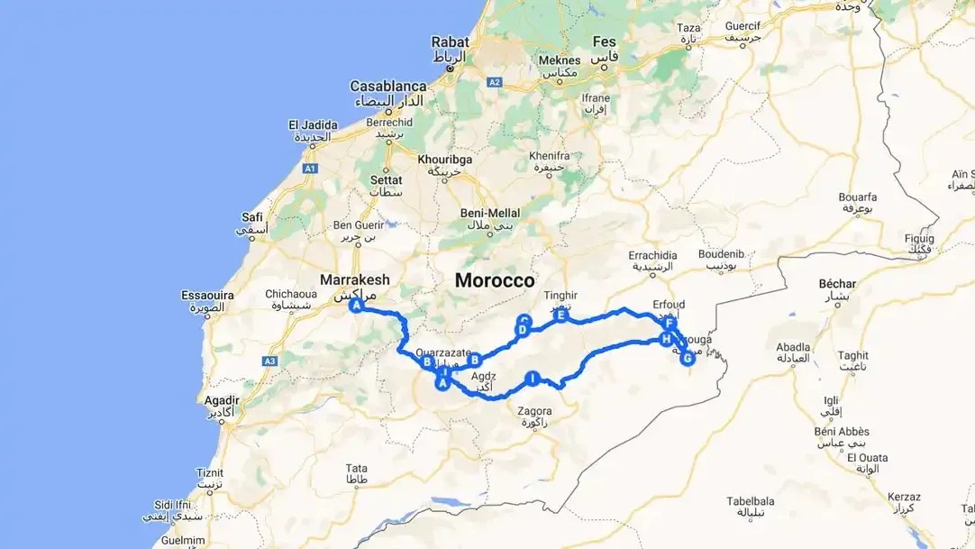 This best 7-day Morocco route is designed as a loop starting and ending in Marrakech. Why Marrakech? Simple — it has the best flight connections, reliable car rental agencies, and positions you perfectly for both the Atlas Mountains and the desert.